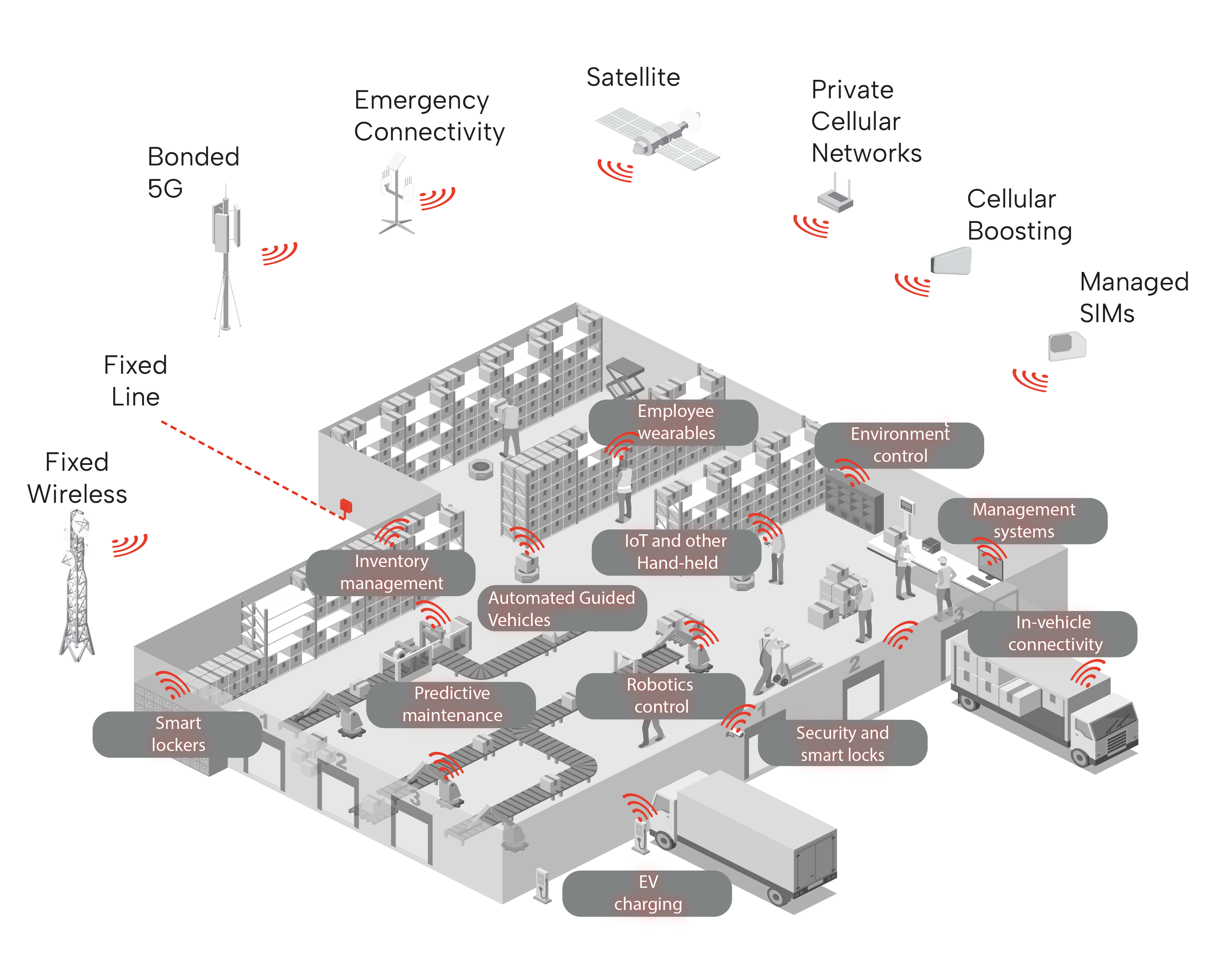 Private Mobile Networks: Private secure networks used for Real-time inventory management, package tracking, and predictive maintenance.